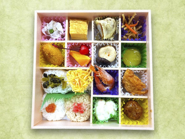 | お弁当の内容 | 二色のわらび餅(みかん・抹茶)、チェリー、レタス、カニカマ天ぷら、海老のフリッター、厚焼き玉子、鶏肉団子、白ご飯(タラコのふりかけ)、海老団子、昆布巻、フキ、梅形蒟蒻、ちらし寿司(錦糸・でんぷ)、かしわご飯、紅ショウガ、白花豆、明太子、白ご飯(梅干し・ごま)、唐揚げのタルタルソースかけ、パプリカ三色、きんぴら牛蒡、シャケ、ポテトサラダ |
