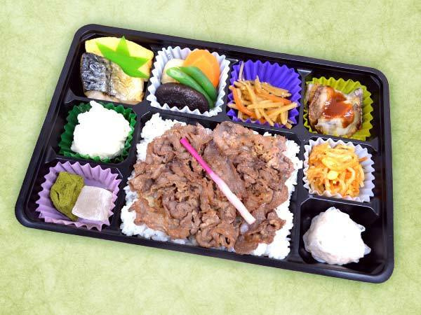 | お弁当の内容 | 白飯、牛焼肉、ポテトサラダ、わらび餅、玉子焼き、サバ、煮物、きんぴら、ナムル、海老シュウマイ、茄子のあんかけ、ハジカミ |
