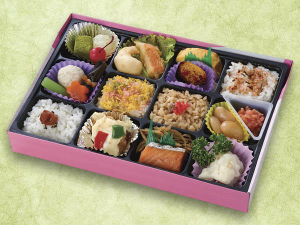 | お弁当の内容 | 二色のわらび餅(みかん・抹茶)、チェリー、レタス、カニカマ天ぷら、海老のフリッター、厚焼き玉子、鶏肉団子、白ご飯(タラコのふりかけ)、海老団子、昆布巻、フキ、梅形蒟蒻、ちらし寿司(錦糸・でんぷ)、かしわご飯、紅ショウガ、白花豆、明太子、白ご飯(梅干し・ごま)、唐揚げのタルタルソースかけ、パプリカ三色、きんぴら牛蒡、シャケ、ポテトサラダ |