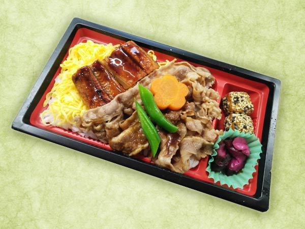 | お弁当の内容 | うなぎの蒲焼、牛焼肉、人参、インゲン、ゴマ団子、桜漬け、錦糸玉子 |