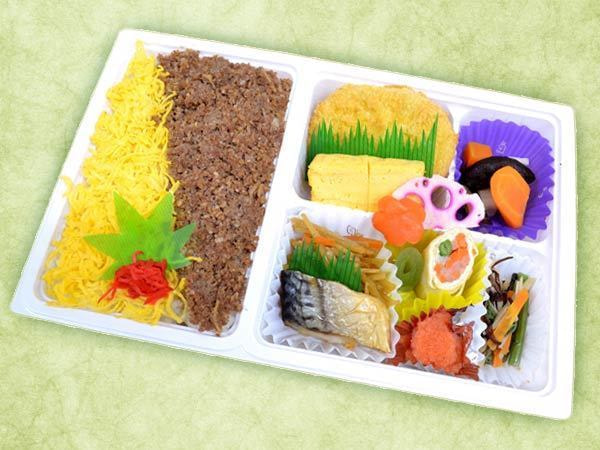 | お弁当の内容 | かしわ飯(紅生姜のせ)、ちらし寿司、高菜のせ飯、明太のせ飯、肉シューマイ、帆立フライ、ちぎり天、巻き玉子、オレンジ、チェリー、ポテトサラダ、唐揚げ、しいたけ、がんも、紅イモ、牛蒡、海老、肉団子、でんぷ |