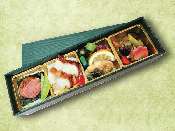 | お弁当の内容 | 葛饅頭、海老団子、薩摩芋の甘露煮、花蓮根、魚ろっけ、鶏の天ぷら、菜の花のおひたしレモン添え、蓮根、昆布巻き、三角いなり揚げ、錦糸とそぼろのご飯、紅ショウガ、白ご飯(高菜漬け)、梅クラゲ、白花豆、明太子、白ご飯(梅干し、ごま)、紅白生酢海老ぞえ、厚焼き玉子、サンマの二色焼き、山菜の味ごはん |