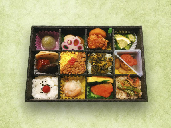 | お弁当の内容 | 二色のわらび餅(みかん・抹茶)、チェリー、レタス、カニカマ天ぷら、海老のフリッター、厚焼き玉子、鶏肉団子、白ご飯(タラコのふりかけ)、海老団子、昆布巻、フキ、梅形蒟蒻、ちらし寿司(錦糸・でんぷ)、かしわご飯、紅ショウガ、白花豆、明太子、白ご飯(梅干し・ごま)、唐揚げのタルタルソースかけ、パプリカ三色、きんぴら牛蒡、シャケ、ポテトサラダ |